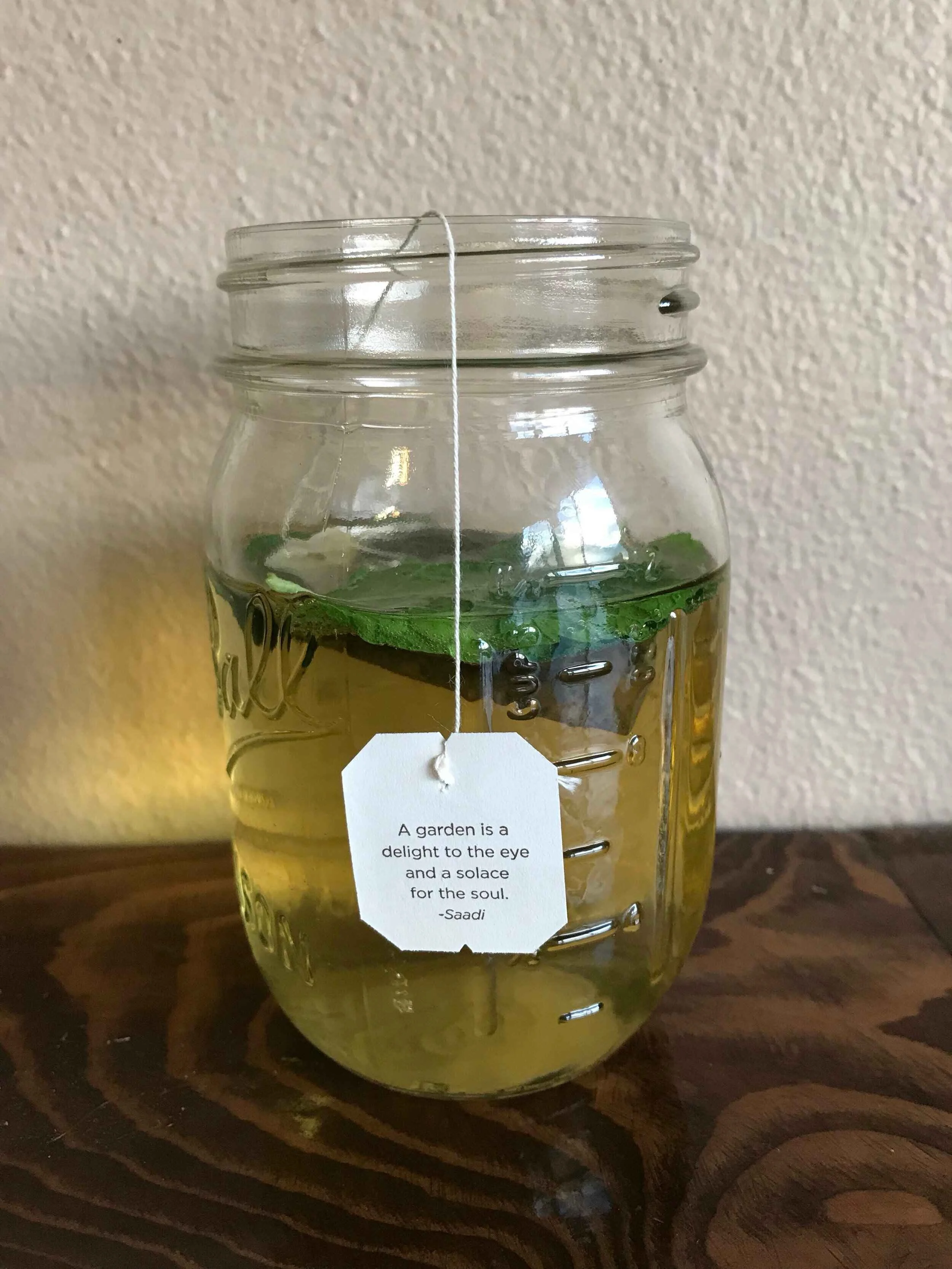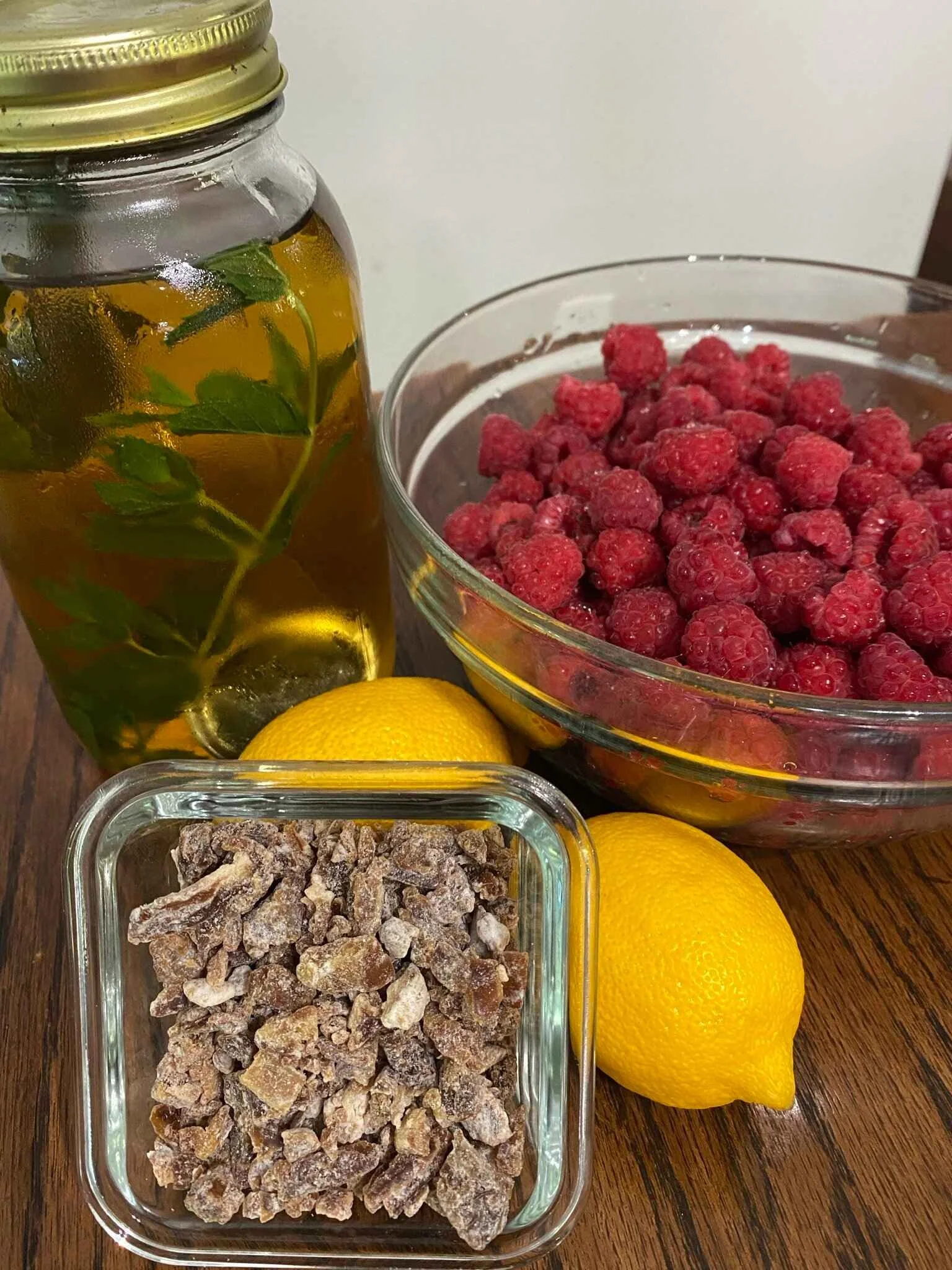 To make your Mocktail, start by bringing 12 ounces of water to a boil and pouring it over your red raspberry leaf tea and a couple spearmint leaves.