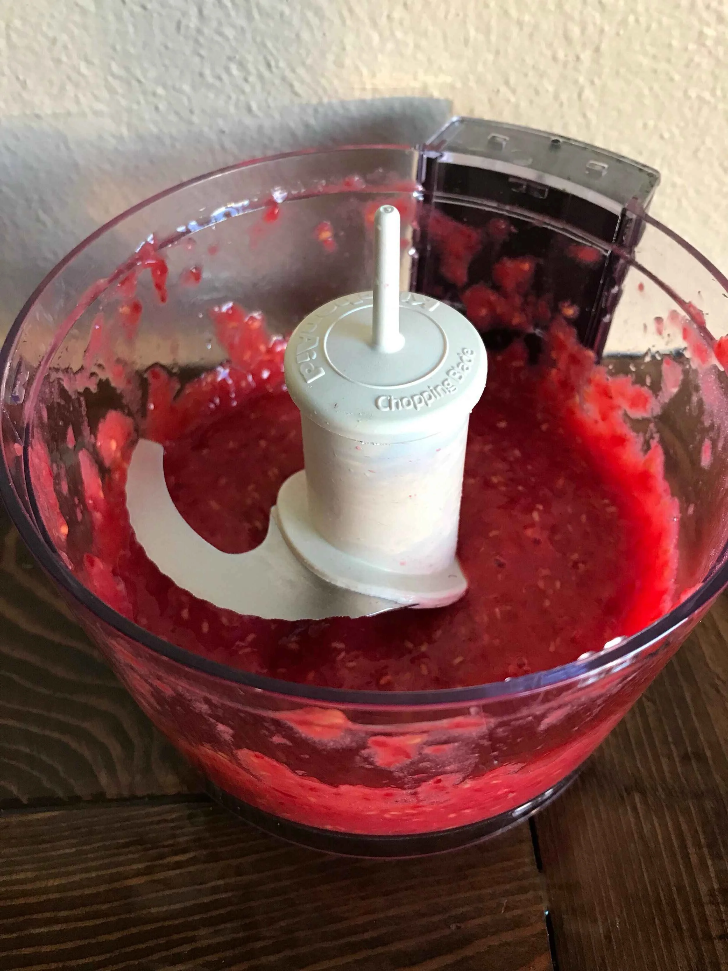 As the tea chills, wash your red raspberries and purée a large handful of them in a food processor, saving a few for garnish.